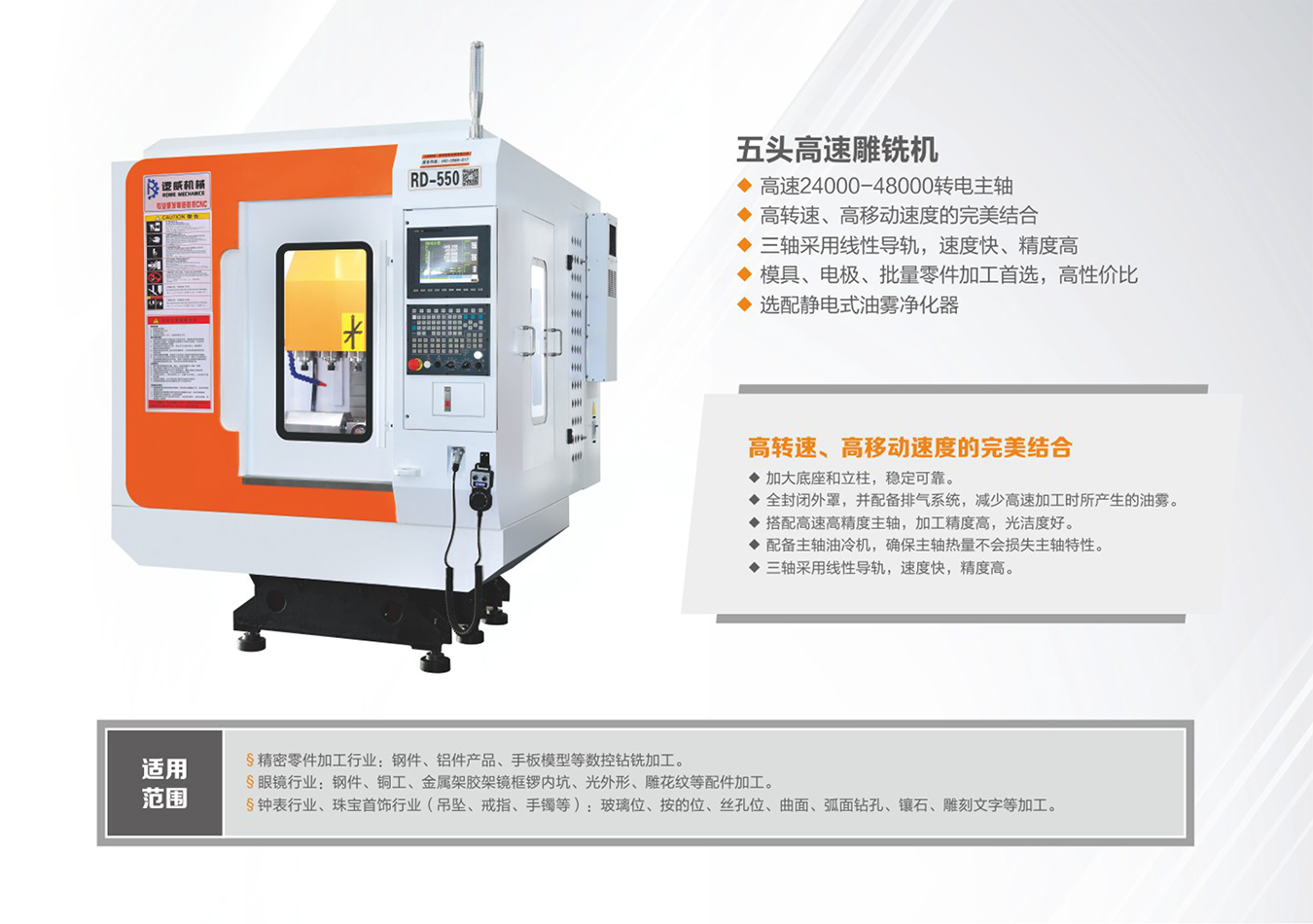 新型環保數控CNC -高速雕銑機采用高速24000-48000轉電主軸,選配靜電式油霧凈化器,三軸采用線性導軌,速度快,精度高,是模具、電極、批量零件加工;采用臺灣新代或臺灣寶元控制系統,日本YASKWA電機及驅動,臺灣上銀、銀泰導軌及滾珠絲桿,華雕精密主軸,是高轉速、高移動速度的結合。
